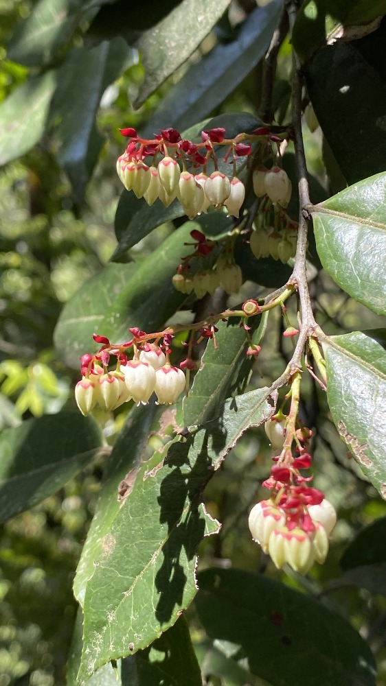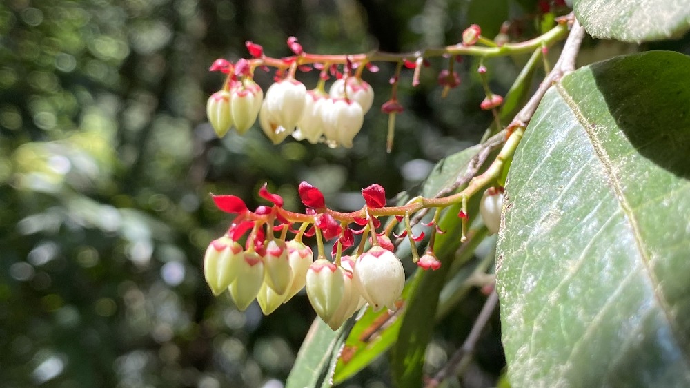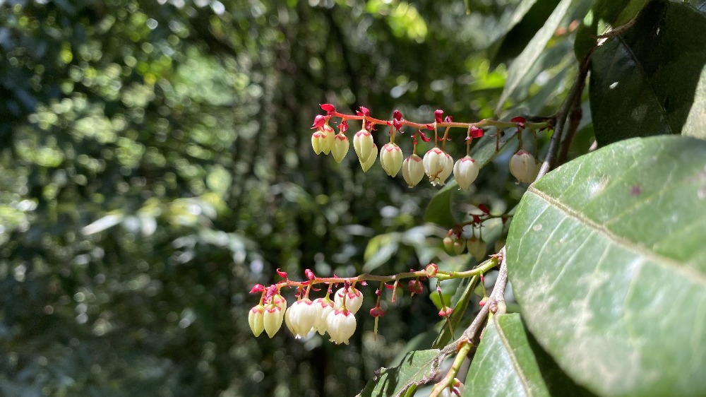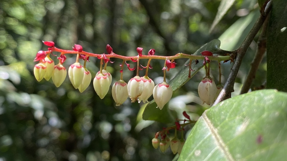 江南越橘是一種杜鵑花科越橘屬的常綠灌木,也常被稱為“江南越桔”。它的花朵呈串狀下垂,花冠為白色或淡綠色,頂端帶有明顯的紅色或粉紅色花萼,形態(tài)如小鈴鐺或小燈籠,極具辨識度。葉片革質、厚實,呈卵狀長圓形或披針形,表面光滑,葉脈清晰。