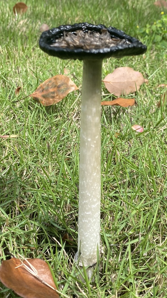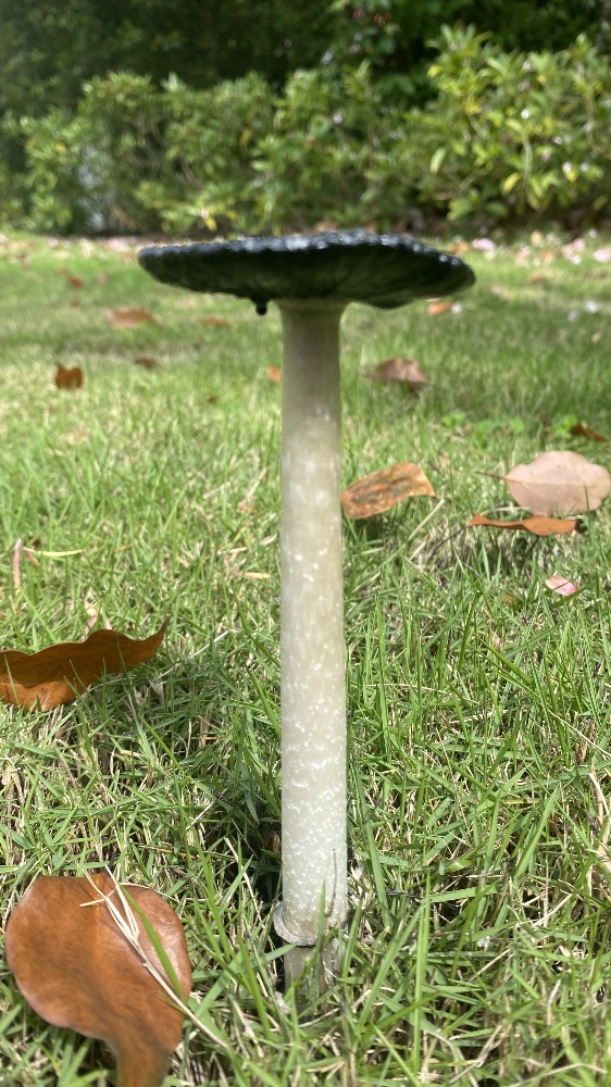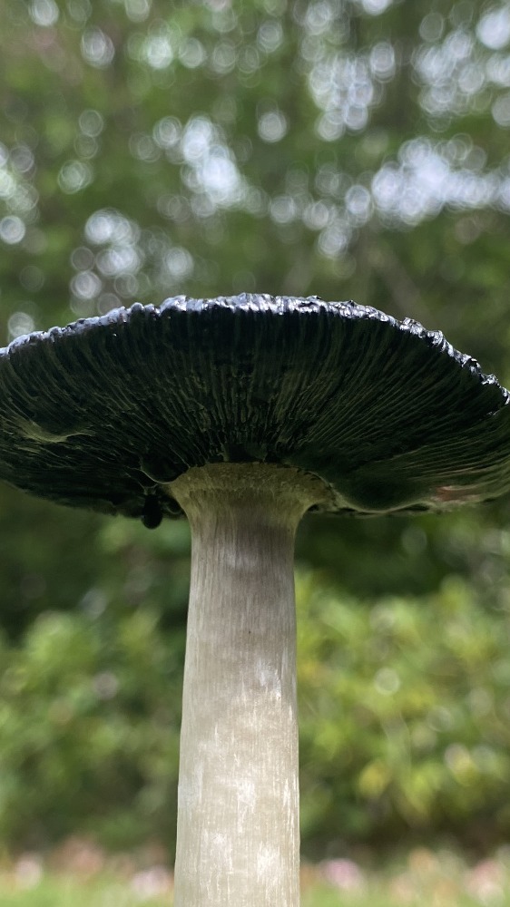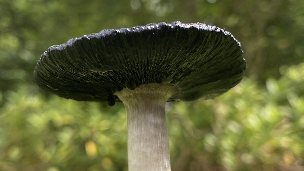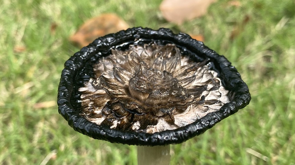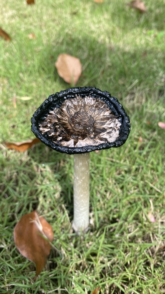 毛頭鬼傘也叫雞腿菇或毛鬼傘,屬于鬼傘科真菌。從圖中可見,它正處于成熟后期,菌蓋已開始自溶,邊緣和菌褶部分化為黑色墨汁狀液體,這是鬼傘類真菌的典型特征。<br>毛頭鬼傘在幼嫩時菌蓋呈圓柱形、潔白緊實(shí),形似雞腿,因此得名“雞腿菇”,此時可食用且味道鮮美。